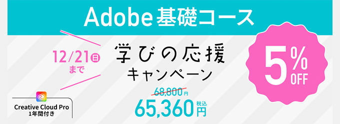 Adobe主要アプリの基礎的なスキルを学べる通信講座に、Adobe Creative Cloud Pro12ヶ月分がついているので、初心者の方にオススメです。
