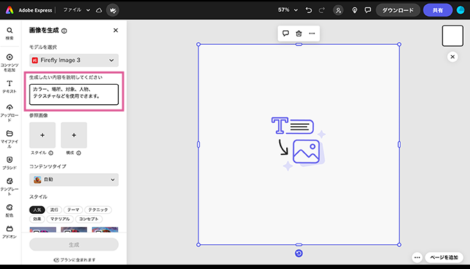 AdobeのAdobe Expressでは、テキストから画像・効果・テンプレート・オブジェクトの生成等ができて便利です。