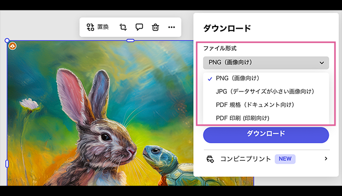 ファイル形式はPNG / JPG / PDFから選択できます。