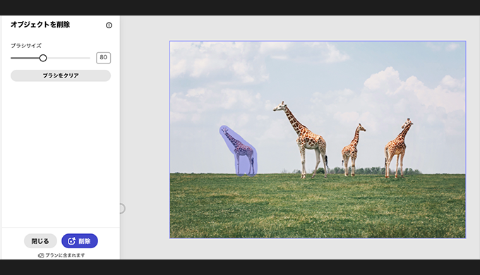 ブラシがでてくるので、ブラシサイズを調整して消したいオブジェクトを選択し、削除をクリックします。