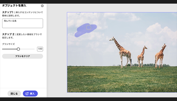 挿入したいオブジェクトをテキストで指示を出し、ブラシで挿入したい場所を指定して挿入をクリックします。