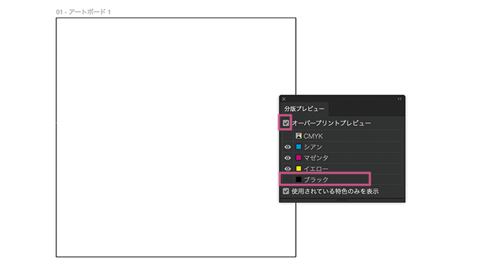 ウィンドウ→分版プレビューからオーバープリントプレビューにチェックを入れ、ブラック版を非表示にすることで何も表示されていなければOKですね。