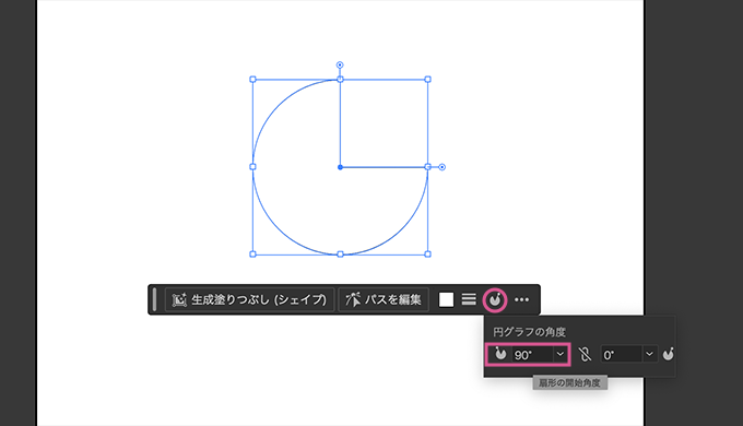 楕円形プロパティのアイコンをクリック→円グラフの角度→扇形の開始角度(終了角度)を設定することで出来上がります。