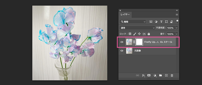 今回は、Firefly Upscalerの4倍サイズにてアップスケール完了しました。