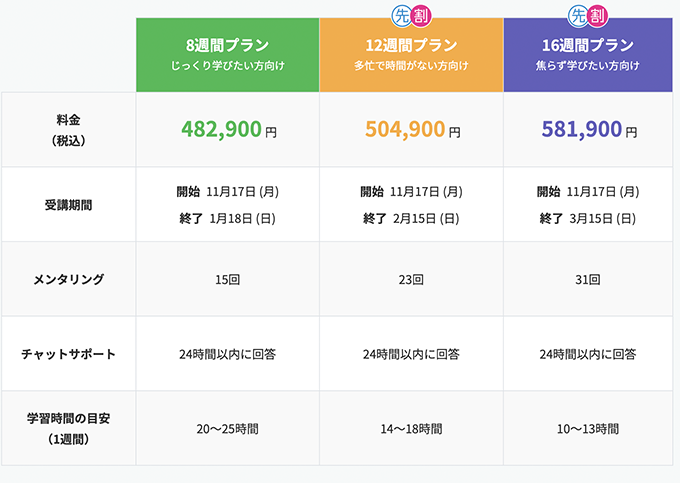 金銭的に余裕のある方は最大16週間プランもあるのでゆっくり学習することができますね。